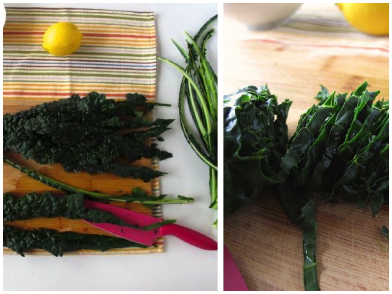 1 . Enjuaga bien la col rizada y secarla con un paño de cocina limpio. Dobla cada hoja por la mitad y corta la parte gruesa del tallo. Luego pícala – enrollándolas será mas fácil y rápido. Utiliza la parte alta de la hoja (mas alejada del tallo), es mas blanda y menos fibrosa.